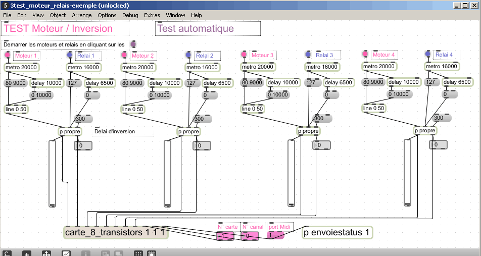 Les patches de test utilisent l'abstraction carte_8_transistors, qui permet d'envoyer des messages Midi indépendants aux huit sorties de la carte donc aux quatre modules d'inversion de moteur testés ici. Plus de détails sont donnés dans la page de patchs dédiée à cette carte.