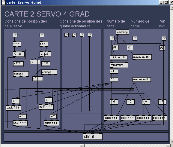 L'objet "carte_2servo_4grad" est une invocation du patch présenté auparavant. Les deux premières entrées servent à piloter les 2 servomoteurs en 3500 pas de résolution, les quatre suivantes servent à piloter les 4 actionneurs en gradation sur 128 pas, la septième permet de choisir le numéro de la carte (voir documentation) et la dernière permet de choisir le canal Midi.