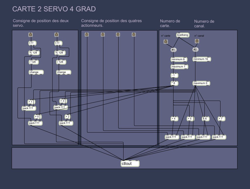 L'objet "carte_2servo_4grad" est une invocation du patch présenté auparavant. Les deux premières entrées servent à piloter les 2 servomoteurs en 3500 pas de résolution, les quatre suivantes servent à piloter les 4 actionneurs en gradation sur 128 pas, la septième permet de choisir le numéro de la carte (voir documentation) et la dernière permet de choisir le canal Midi.