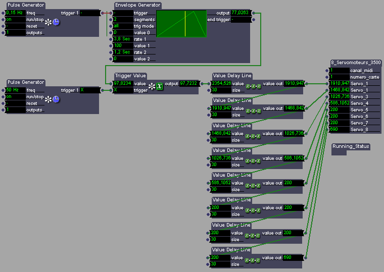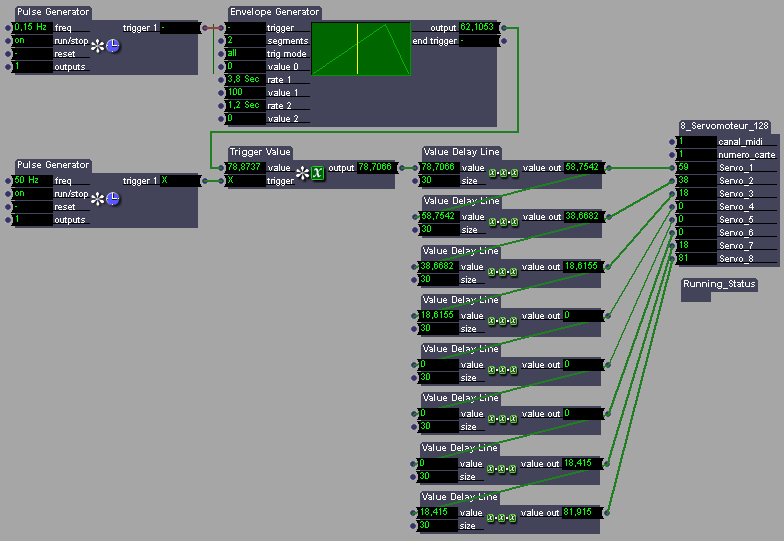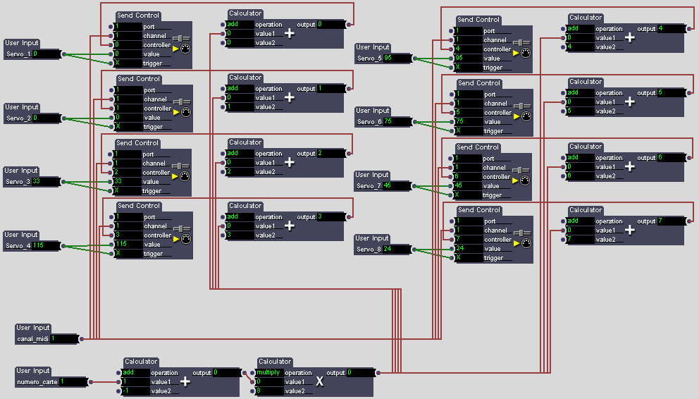 L'actor 8_servo_128 peut être utilisé simplement dans n'importe quel patch. La première entrée permet de choisir le canal Midi utilisé, la deuxième le numéro de carte. Les huit suivantes servent à piloter les servo-moteurs en gradation sur