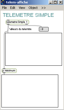 Le patch 1 telemetreSimple.maxpat est utilisé en tant qu'objet. L'entrée permet de configurer le canal Midi correspondant à celui de la carte. Dans cet exemple précis le télémètre est réglé sur le canal MIDI 1, donc "telemetreSimple" est suivi du paramètre "1".