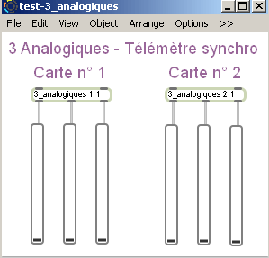 Ce patch permet de visualiser les données envoyées par des capteurs analogiques en résolution 128 pas. Les messages Midi sont des Control Change. Afin de ne pas mélanger les données dans le cas où plusieurs télémètres synchro sont branchés les uns sur les autres et utilisent le même canal Midi, les numéro de Control Change des entrées analogiques dépendent du numéro du Télémètre.