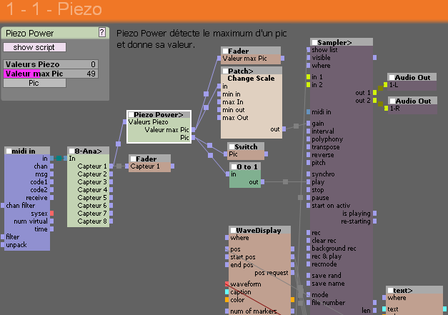 Les valeurs du capteurs sont envoyées sur l'entrée du script, les deux résultats concernant le pic sortent à droite et sont dans cet exemple traités pour actionner un sampler.