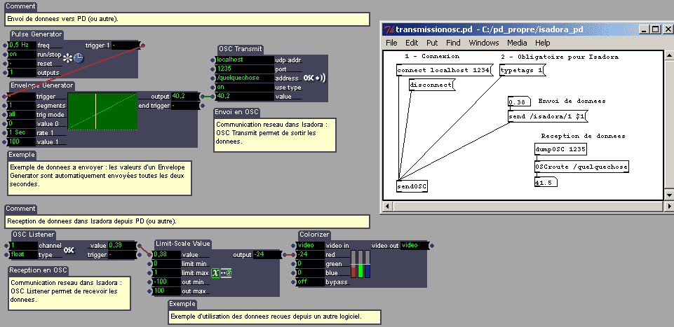 Peu d'objets sont nécessaires pour communiquer en OSC : un récepteur reçoit les données de l'extérieur du logiciel et un transmetteur en envoie d'autres. Chacun de ces objets prend en compte des paramètres de numéro de port, d'identification de machine sur le réseau et de tri des données. Si vous souhaitez plus de renseignements sur les paramètres OSC, vous pouvez vous reporter aux explications données dans le manuel d'Isadora et dans les docs respectives des objets PD. La librairie OSC doit être installée dans PD.