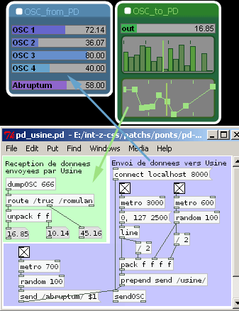 Si les metro du patch PD sont activés, lorsque les deux fichiers sont ouverts en même temps, et que l'OSC est activé dans Usine, vous devriez observer l'arrivée régulière de données dans ce dernier.