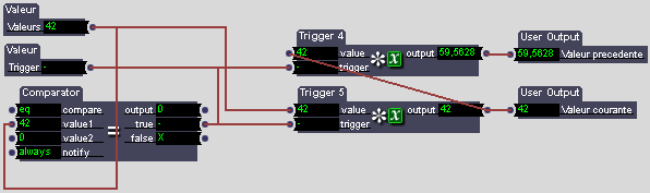Cet actor n'a que deux sorties, donnant la valeur courante, qui vient d'être envoyée dans l'entrée valeurs, et la valeur précédente. Comme précédemment, la valeur n'est prise en compte que lorsque l'entrée trigger a été activée.