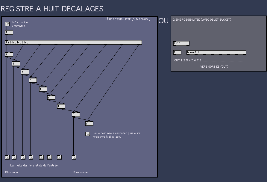 L'objet Bucket donne le même résultat que ce registre à décalage mais nécessite d'avoir Cyclone installé avec Pure Data.