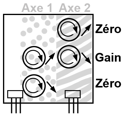 - Ce capteur dispose de deux réglages pour chaque axe : sensibilité et niveau de zéro, ce qui permet de le transformer à loisir en accéléromètre très peu dépendant de l'inclinaison ou bien en inclinomètre hyper-sensible.