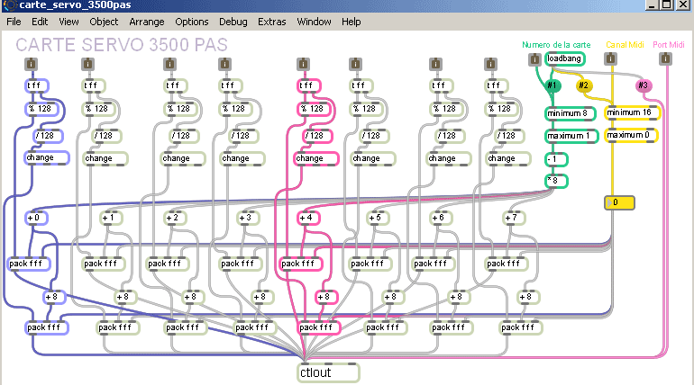L'objet "carte_servo_3500pas" est une abstraction, présentée dans le Patch précédent. Les huit premières entrées servent à piloter manuellement les 8 servomoteurs, la neuvième permet de choisir le numéro de la carte, la dixième est pour le choix du canal Midi et la dernière permet de choisir le port Midi (interface Midi-USB par exemple). Ces paramètres peuvent se mettre en arguments.