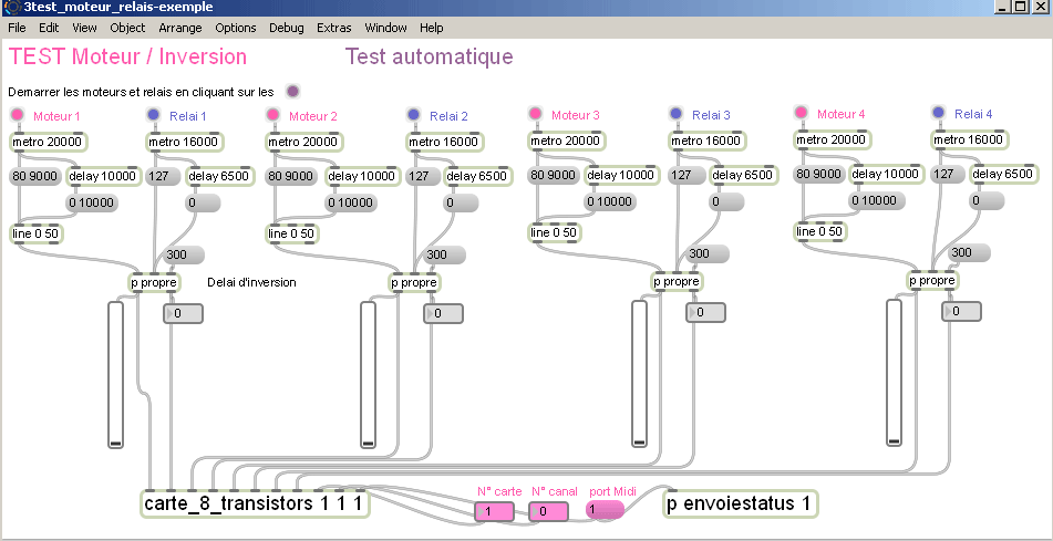 Inversion de moteurs continus avec Max Les patches de test utilisent l'abstraction carte_8_transistors, qui permet d'envoyer des messages Midi indépendants aux huit sorties de la carte donc aux quatre modules d'inversion de moteur testés ici. Plus de détails sont donnés dans la page de patches dédiée à cette carte.