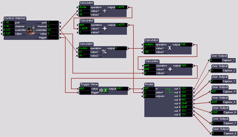 Les objets Midi utilisés dans ces patches sont présentés en détail dans les pages Réception des données en Midi. Attention : ce module utilise tous les numéros de Control Change d'un canal Midi. Pour utiliser d'autres cartes en même temps qu'une Mini-HF, il faut qu'elle soit sur un canal différent.