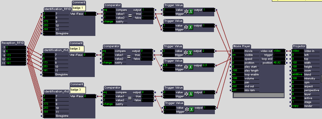 Principe : passer un tag sur la borne, cliquer sur l'entrée Enregistrer de l'actor que l'on veut associer à ce tag. Poser un deuxième actor et enregistrer un deuxième tag de la même manière. Les chiffres détectés apparaissent simultanément sur tous les actors, mais seul celui correspondant au tag enregistré donne un 1 en sortie. Les actors sont tous indépendants les uns des autres et permettent d'enregistrer et d'individualiser autant de tags que l'on veut.