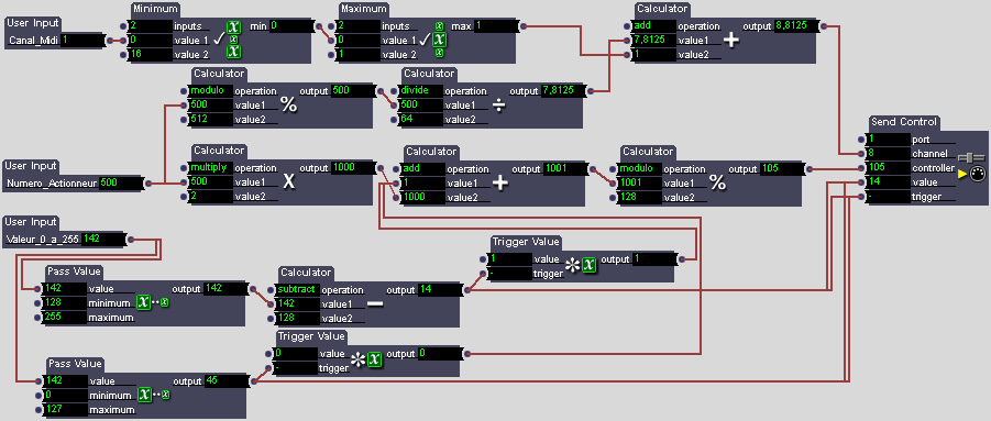 Les messages Midi acceptent 128 valeurs différentes tandis que les instructions DMX permettent d'avoir 256 pas. Cet actor permet de distribuer 256 valeurs sur deux Control Change, donc de piloter un actionneur avec autant de finesse que le permet le protocole DMX.