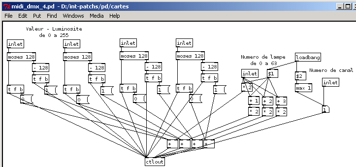 Les messages Midi acceptent 128 valeurs différentes tandis que les instructions DMX permettent d'avoir 256 pas. Cette abstraction Pure Data permet de distribuer 256 valeurs sur deux Control Change, pour quatre actionneurs en sortie, donc de piloter ces 4 actionneurs (projecteurs par exemple) avec autant de finesse que le permet le protocole DMX.