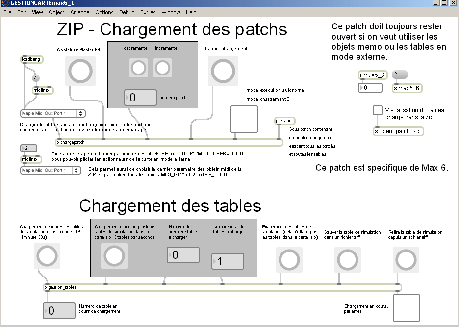 Ce patch de gestion sert à télécharger un patch Max 6 dans la carte ZIP. Il sert à la rendre autonome, et permet de basculer entre les modes Externe et Autonome. Pour ce faire, il faut connecter les deux câbles Midi, Input et Output, pour que le téléchargement de patch fonctionne (Out du port vers In de la ZIP, Out de la ZIP vers In du port Midi). Si la ZIP est prévue pour piloter d'autres cartes capteurs ou actionneurs via ses prises Midi, il faut momentanément les débranche pour charger le patch dans la ZIP, ou bien utiliser un split Midi.