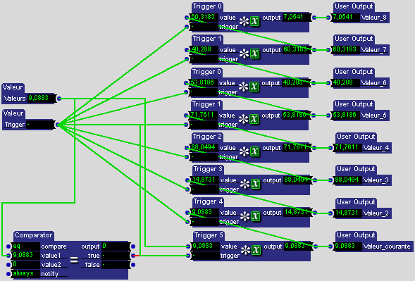 Cet actor n'a que deux sorties, donnant la valeur courante, qui vient d'être envoyée dans l'entrée valeurs, et la valeur précédente. Comme précédemment, la valeur n'est prise en compte que lorsque l'entrée trigger a été activée.